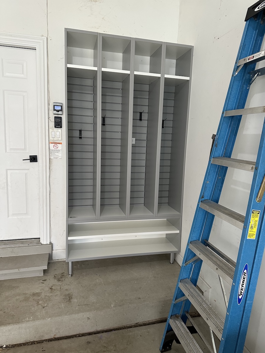 We installed a custom-designed locker and shoe cabinet combo with slatwall backing, giving the family ultimate flexibility to store coats, jackets, backpacks, and everyday essentials. On the adjacent wall, three Monkey Bars heavy-duty storage systems were the perfect solution for bikes, sports equipment, and garden tools, while keeping shelves free for bulky storage bins. This thoughtful layout makes it easy for everyone to grab what they need—and put it back where it belongs.